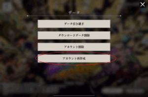 3.出なかったらタイトルに戻り、右下のデータからアカウント再作成を選択、チュートリアルをスキップです。